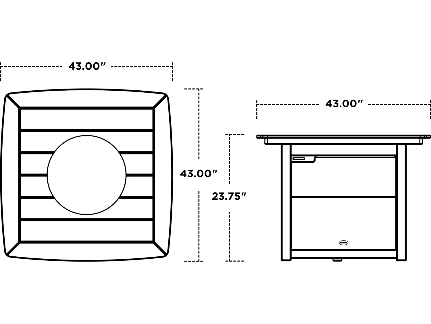 - Dimensions: 43”W x 43”D x 23.75”H